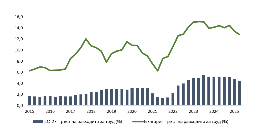 България отчита най-големия растеж на разходите за труд в ЕС. Възнагражденията у нас се удвояват в период от 5 – 6 години и продължават да нарастват с двуцифрен темп. Тук роля има и бюджетната политика, която увеличава ударно заплатите в ключови сектори (вътрешен ред и сигурност, отбрана, образование) и залага рекордни разходи за персонал – пробивайки границата от 10% от БВП за пръв път през последните над две десетилетия. През 2025 г. се наблюдава известно охлаждане при растежа на възнагражденията в частния сектор, но държавната политика крие много рискове. Ново увеличение на заплати в публичния сектор, вдигане на минималната заплата, повишаване на осигурителната тежест и максималния осигурителен праг – това са политики, които бутат разходите за труд нагоре в средносрочен план.