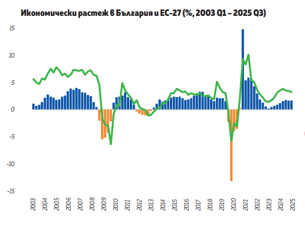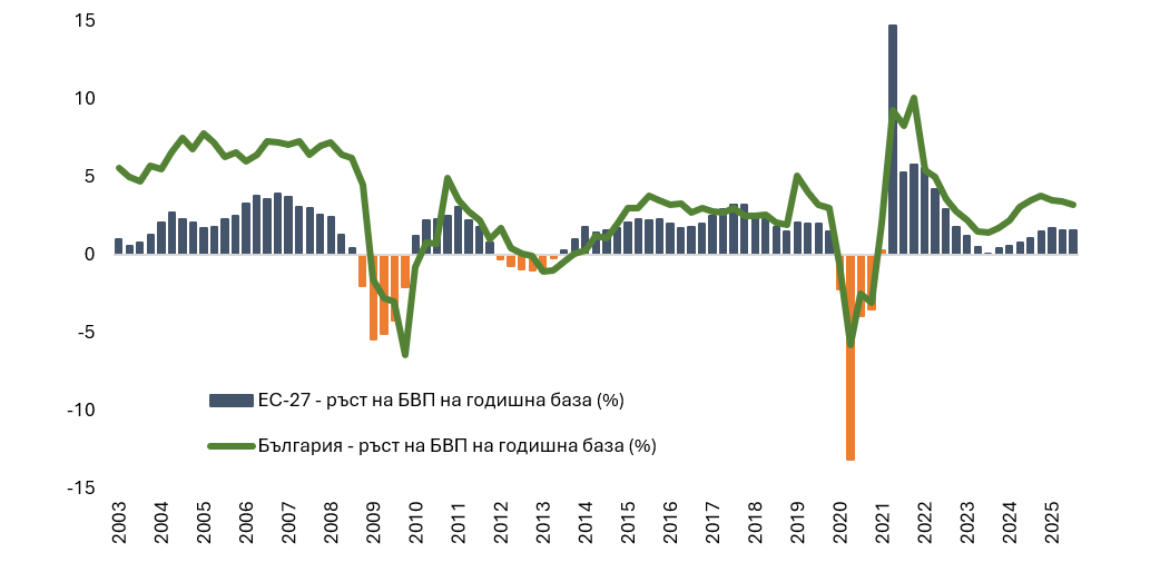 Икономически растеж в България и ЕС-27 (%, 2003 Q1 – 2025 Q3)