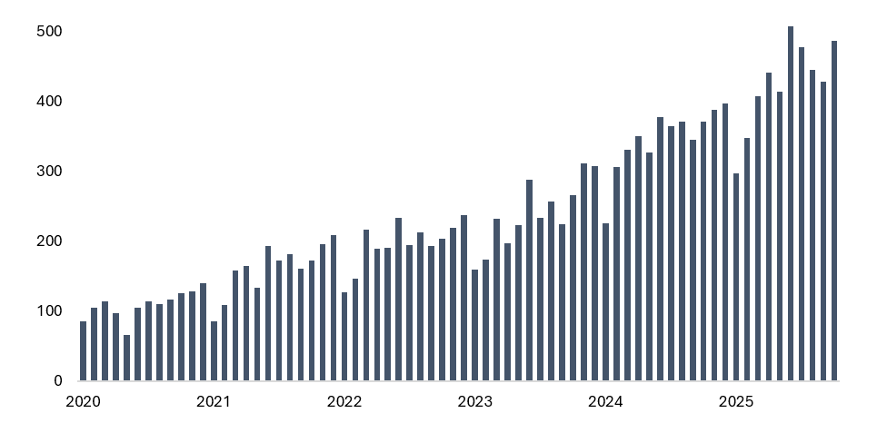 Банковото кредитиране също постига рекорди, като новоотпуснатите жилищни кредити достигат 500 млн. евро (близо 1 млрд. лв.) на месец през втората половина на 2025 г. Това е на практика удвояване на мащаба на жилищното кредитиране спрямо края на 2022 и началото на 2023 г. Ефектът е видим в цените на жилищата в София, които продължават да нарастват в навечерието на приемането на еврото. Цените на жилищата в страната отчитат двуцифрен растеж в поне 12 поредни тримесечия. През голяма част от този период страната е в топ 3 на ЕС по поскъпване на имотите. Очакванията за леко затишие са налице, но ефектът на еврото може да даде нов импулс на растежа.
