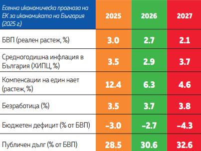 Официалните прогнози за България остават сравнително оптимистични, макар да светят и редица червени лампи. Икономическият растеж в страната се очаква да бъде в рамките на около 3% през 2025 г., постепенно забавяйки се до 2.7% през 2026 г. и 2.1% през 2027 г. (оценки на ЕК). Прогнозите на Министерството на финансите и Българска народна банка дават малко по-различна картина, като също показват леко забавяне на растежа, но без съществена разлика през 2026 и 2027 г. Очакванията са растежът да продължи да бъде воден от потреблението, подкрепено от високите нива на заетост и увеличаване на възнагражденията, както и от импулса в държавния бюджет и силното кредитиране. Големият въпрос е каква ще е динамиката на инвестиционната активност в страната и доколко тя ще ускори растежа, като несигурността се отнася както до намеренията за публични инвестиции, така и до инвестициите на компаниите в частния сектор.