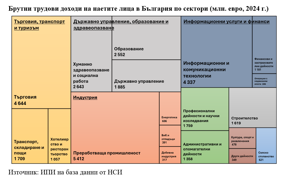 През 2024 г. брутните трудови доходи на наетите лица в България достигат 33.2 млрд. евро. Търговията, транспортът и туризмът дават работа на близо 650 хил. наети и носят 7.4 млрд. евро брутни трудови доходи, концентрирани най-вече в широкия сектор на търговията. Индустрията поддържа над 500 хил. работни места и носи 6,7 млрд. евро трудови доходи, в т.ч. 5.4 млрд. евро в преработващата промишленост. Дигиталният и финансовият сектор дават работа на над 200 хил. души и носят 5.8 млрд. евро трудови доходи, в т.ч. над 4.3 млрд. евро в информационните и комуникационните технологии. Професионалните и административните дейности носят допълнителни над 3.1 млрд. евро трудови доходи. В обществения сектор работят 24% от всички наети в страната, които получават 1/4 от брутните трудови доходи на наетите лица. Над 2/3 от всички наети в обществения сектор работят в сферите на образованието, здравеопазването и социалните дейности, както и държавното управление. Образованието и здравеопазването (в т.ч. социалните дейности) осигуряват работа на съответно 170 и 180 хил. души и носят трудови доходи в размер на по 2.6 млрд. евро. В държавното управление работят над 110 хил. души, които получават брутни трудови доходи в размер на близо 1.9 млрд. евро. |