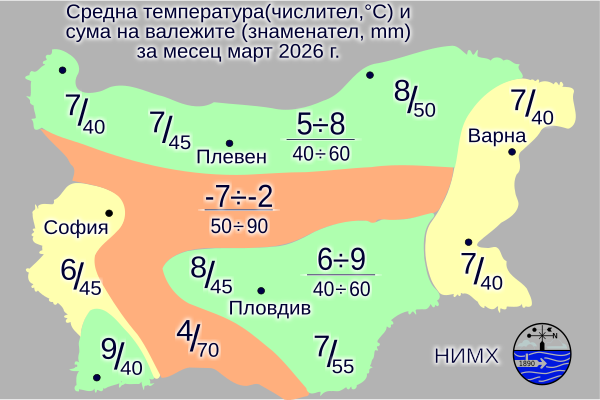 Тази година през март се очаква средната месечна температура да бъде около и над нормата, която в Северна България и високите полета е между 5° и 7°, по Черноморието и в Южна България - между 6° и 9°, а в планините - между минус 8° и минус 2°.