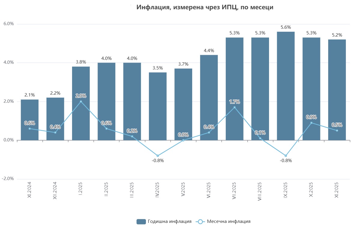 Инфлацията от началото на годината (ноември 2025 г. спрямо декември 2024 г.) е 4.8%, а средногодишната инфлация за периода декември 2024 - ноември 2025 г. спрямо периода декември 2023 - ноември 2024 г. е 4.4%.