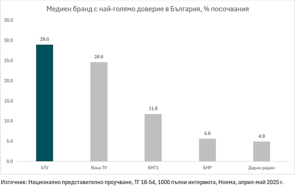 bTV е медийният бранд с най-голямо доверие в България (национално представително проучване, Ноема, 18-54 г., проведено април-май 2025 г.), с близо 18% повече от следващата телевизия в класацията. През последното десетилетие bTV е и първият избор за гледане на телевизия според данните на национално представителни проучвания на Маркет Линкс или Ноема за съответната година, проведени сред лица на възраст между 18 г. и 54 г.
