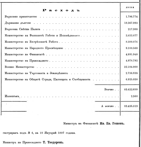В прелома между 19-и и 20-и век значитено започват да се увеличават и военните разходи. В бюджета за 1897 година те възлизат на 22.1 млн. лв., или почти една четвърт от всички разходни пера (83.4 млн. лв.). Веднага след тях се нареждат разходите за обслужването на държавния дълг (18.3 млн. лв.). Значителна тежест се пада и на Министерството на народното просвещение (9.2 млн. лв.), Министерство на вътрешните работи (8.38 млн. лв.) и Министерството на общите сгради, пътищата и съобщенията (6.92 млн. лв.).