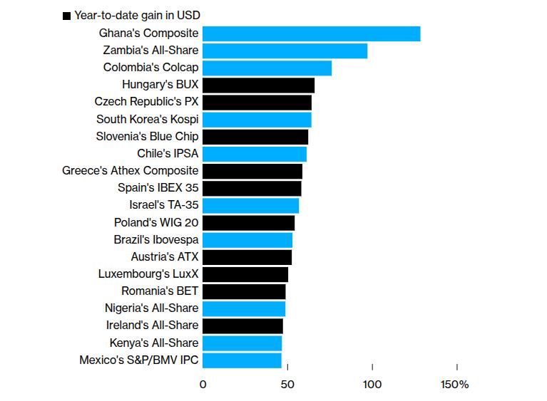 Общо 10 от първите 20 пазара с най-голям ръст тази година са в Европа — постижение, отбелязвано само през 2004, 2015 и 2023 г. от създаването на еврозоната насам. Макар че бенчмарк индексите в Германия и Франция са по-ниско в класацията — съответно на 34-то и 53-то място — те все пак изпреварват значително S&P 500, който е на 63-то място в доларово изражение сред общо 92 глобални индекса, следени от Bloomberg.