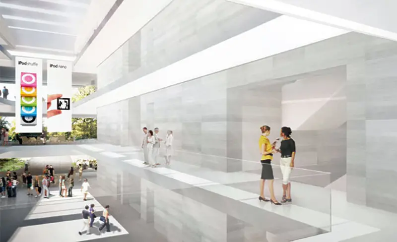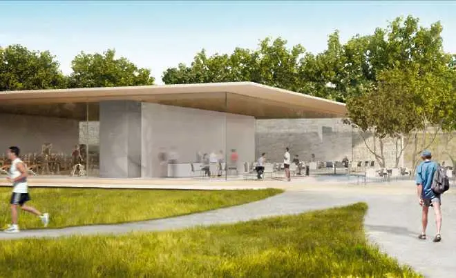 На тях виждаме за първи път подобния на научнопопулярен макет вход към подземния паркинг на кампуса, дизайнерската кафетерия, която сякаш се разлива в тревата отвън и стъкления павилион, който ще служи за вход към новата подземна конферентна зала на Apple, достойна за шпионска агенция от високобюджетен филм. Всичко това трябва да бъде готово до 2016 г.